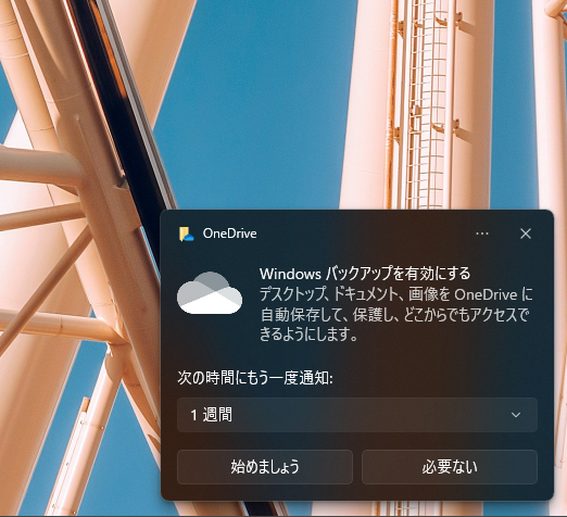 画面右下に出るOneDriveの「Windowsバックアップを有効にする」